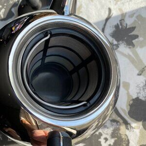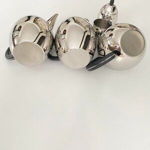 Retro Heavier gauge Stainless Steel Coffee Tea Water Cream Sugar Set. Details: Polished exterior, Durable hard black handles enforced with steel in center, Rubber lid tops, tea strainer, Sugar pot with lid, sugar spoon, handleless creamer, water jug, coffee & tea pots, no dents or damages. Super minimal signs of use on exterior & interior, except interior tea pot has light tea staining as pictured. Used by my aunt a handful of times over the years, beautifully maintained.