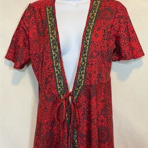Aller Simplement Red & Black Floral, Short Sleeve, Long, Tie Front, Suit Jacket. Business casual. Lightweight. Silky feel. No stretch. 100% polyester material. Gently used with no stains or flaws.