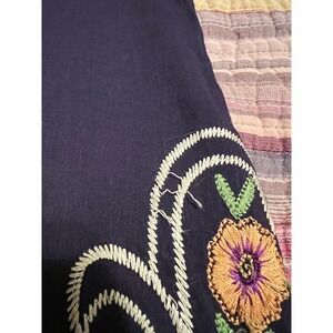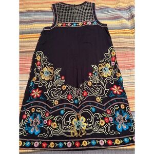Stunning embroidered dress with vibrant detailing, perfect for adding a touch of bohemian flair to your wardrobe. This sleeveless dress features a beautiful black background adorned with intricate floral embroidery in a multitude of colors, including blues, reds, yellows, and greens. The craftsmanship is evident in the delicate stitching and unique design. Adding to its charm, the neckline is embellished with a distinctive grid pattern. There is an area on the dress where the embroidery has come slightly loose from the fabric.