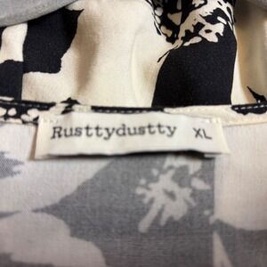 The Rusttydustty Dress is a black floral boho maxi dress designed for women in size XL. It features a V-neckline with button down front , elastic waist with black belted tie, long bell sleeves, and a woven viscose fabric. Perfect for the summer, fall, and spring seasons, this hippie-inspired dress exudes a boho chic style that is both comfortable and trendy. The intricate pattern adds a touch of vintage flair to this unique and eye-catching piece from the Rusttydustty brand.