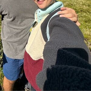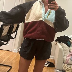 Cozy fleece sweatshirt with a multicolor design. Features a zippered front pocket and high collar. Perfect for casual wear.