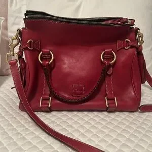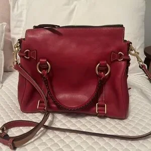 Chic satchel with a rich burgundy hue. Features sturdy handles and elegant gold-tone accents. Perfect for everyday style.