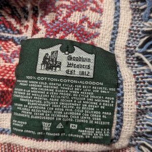 Vintage Goodwin Weavers lighthouse tapestry throw blanket, 100% cotton, measuring approximately 63″ long x 44″ wide (fringe included). Classic nautical design featuring multiple iconic lighthouse scenes — great for coastal home décor, cabin accent, wall hanging or cozy throw. Made in USA woven cotton with lovely fringe edges.