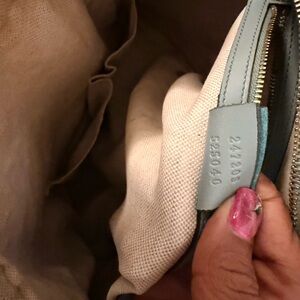 Elegant Gucci satchel with iconic pattern. Features tan and blue tones. Stylish and versatile. pre-love condition please see where blue light blue leather. There is a fade. Also have a stain inside please see picture.