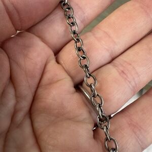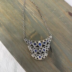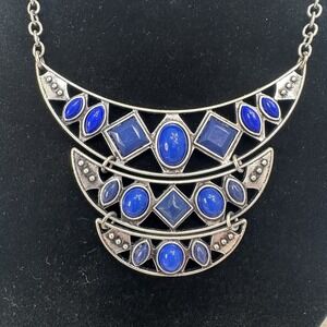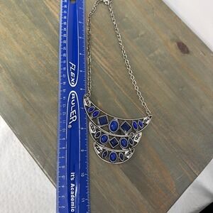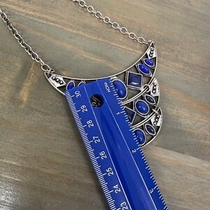 Retro blue and silvertone setting statement necklace with diamond, oval, and ellipse shapes in a crescent frame! Small amount of tarnish on chain and clasp.