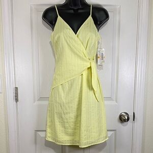 New with tags! This pastel yellow mini dress by Gianni Bini is flirty and fun with a flattering wrap-style front and spaghetti straps. Made with lightweight cotton fabric featuring subtle texture and vertical stripes, it’s perfect for summer outings, vacation looks, or casual brunch dates. The side tie detail enhances the waist for a feminine silhouette.