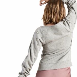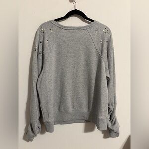 Embellished French Terry Long Sleeve Top. It is a grey French terry sweatshirt featuring faux pearl and bead embellishments on the shoulders, which allow it to be worn comfortably while still looking dressed up.