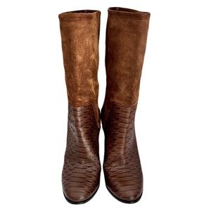 Gorgeous gently preowned Vince ‘Dalton’ amber brown suede and embossed snakeskin leather heeled boots.
