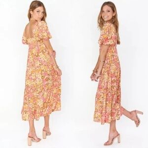 The perfect balance of boho and sophistication, this floral midi dress will be your new go-to for when you need to up the dress level. It has the golden trio - a flattering square neck, juxtaposed next to a poof sleeve, and fits to perfection with a smocked back. Met with a comfortable flowy skirt, you're going to love this new midi.