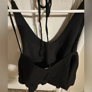 The drawstring actually is supposed to go around your neck and criss cross in front. Very cute.