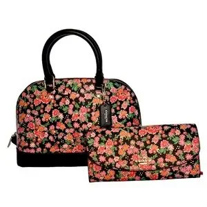 COACH Sierra Posey Cluster Floral Coated Canvas Satchel Bag Black/Pink Wallet