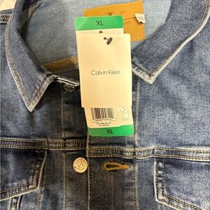 denim jacket by Calvin Klein. Features button-up front and classic design. New with Tags