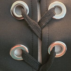 This dress features a striking lace-up front with oversized silver grommets, creating an adjustable and flattering fit. Matching lace-up accents at the cuffs add a coordinated, fashion-forward touch.