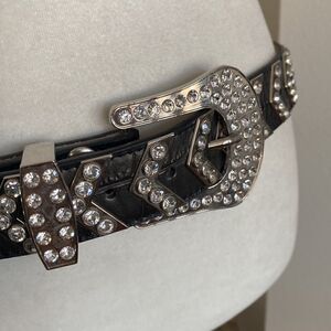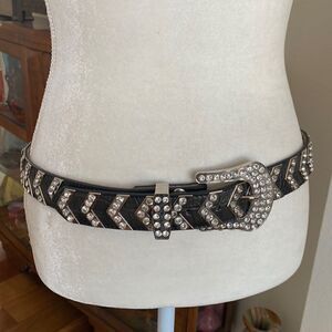 Wonderful metal/rhinestone and embossed leather belt. No missing parts. Measures 41” x 1.25”. So size I would guess is L/XL.