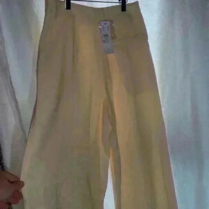 NWT Top Shop pale yellow high waisted wide leg pleated pants. Viscous/ Polyester blend. Size 4. In excellent new condition. Waist measures 28”. They do seem to be for a more petite individual, if you want the cuff to end below the ankle. On a taller person, they appear more cropped. 38” waistline to hemline & 26” inseam.