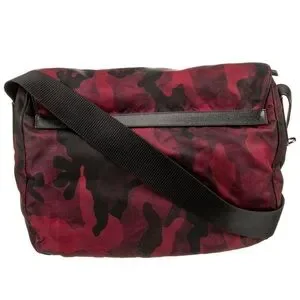 Red camo nylon messenger bag with adjustable crossbody strap, double buckle closures with leather straps, front zip pocket, logo lining and inner zip pocket with card holder by Prada. Excellent condition. Bought off The Real Real. All photos are of actual bag for sale. Rare HTF!