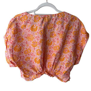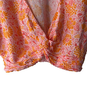 Brighten your wardrobe with this vibrant Zara floral crop top. New without tags, this lightweight blouse features a bold pink and orange floral print, a flattering deep V-neck, and a front twist-knot detail for a trendy, feminine look. Perfect for pairing with high-waisted jeans, skirts, or shorts for summer outings, festivals, or vacation wear.