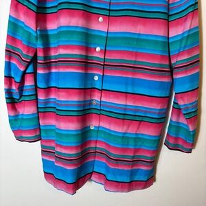 A vibrant statement piece, this Talbots top instantly elevates any ensemble. A kaleidoscope of pink, blue, and green stripes creates a visually stunning effect, while the button-down front offers versatility in styling—wear it buttoned up for a polished look or open as a lightweight layer. The silky texture feels luxurious against the skin. Imagine wearing this standout top to a casual brunch with friends, a sunny afternoon at an art gallery, or a chic outdoor garden party. Tag appears to be from early 90's