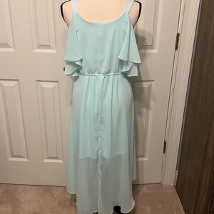 Gently used mint green cold shoulder dress. Ruffled sleeves. Elastic waist missing belt. Size L (11-13) Under dress 29.5 L and chiffon over dress 43” L. 16” PTP. No rips, tears or stains.