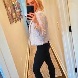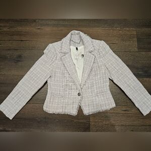 Brand new with tags! This is a fully lined stylish tweed plaid blazer in a light pastel purple color combination. Perfect to pair with jeans or dress pants!