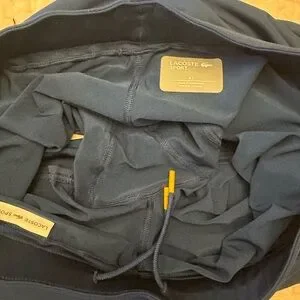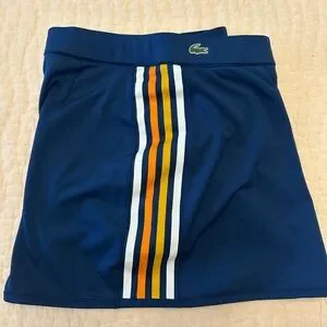 Navy Athletic skirt featuring Lacoste logo. Accented with multi color stripes, and built in shorts!