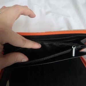 Stylish gray wallet with bold orange and white stripes. Perfect for everyday use.