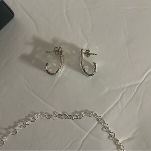 The earrings are about 1 inch long from top to bottom. When the necklace is stretched out, it measures about 8.5 inches. The hook end of the necklace has an engraved “Original Oval” charm. The maroon mitten makes a nice storage for the jewelry box included to secure the necklace and earrings.