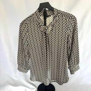 Chic blouse with a striking black and white pattern. Features a stylish tie neckline and three-quarter sleeves with a tie at the neck.
