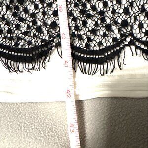 This dress features an elegant lace overlay with scalloped details and a comfortable fit. The black and white design adds a timeless sophistication to any wardrobe.