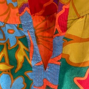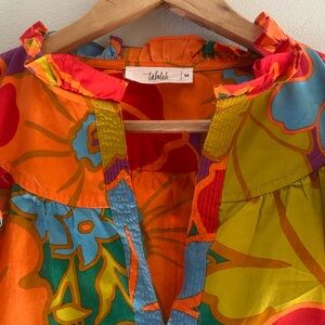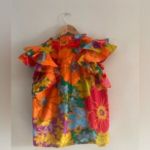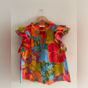 Vibrant blouse with ruffle sleeves. Features a bold floral pattern in red, orange, blue, and green. Size M in perfect condition colorful 100%cotton