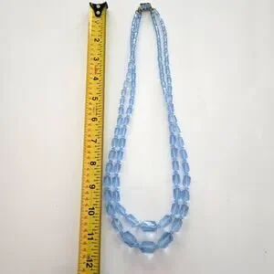Vintage mid-century Austrian crystal double strand necklace. Faceted ice-blue glass crystals. Marked “Made Austria” at the decorative rhinestone box clasp, confirming authentic post-war Austrian crystal craftsmanship from the 1950s era. Two graduated strands of pale blue faceted crystals, separated by delicate spacer beads for added dimension. Finished with a silver-tone box clasp accented with three matching blue rhinestones. Matinee length - approx. 24".