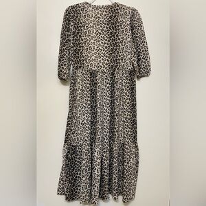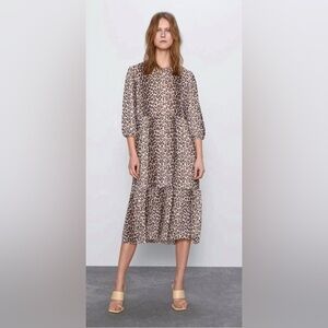 Stylish leopard print dress by Zara. Features a flowing design with three-quarter sleeves. Perfect for any occasion.