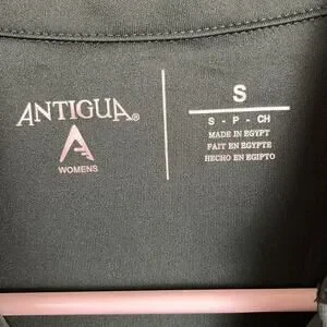 Antiqua Women's Golf Shirt. Size Small. Green with Green & White stripes on the sides. Short Sleeve. Collared with a 2 Button front placket. 100% Polyester. Style is W's Venture. Armpit to armpit is 18 inches. Shoulder to hem is 25 inches.