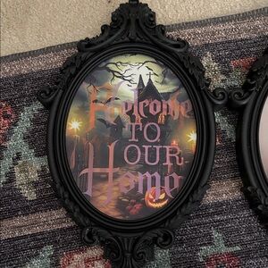 Set of two gothic black ornate wall art pieces. Features a spooky Halloween theme with intricate designs. Also has spooky sounds that are triggered by motion