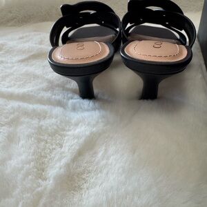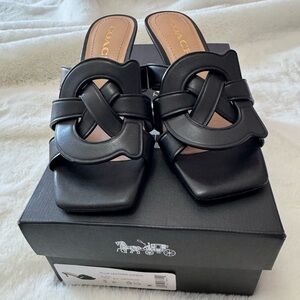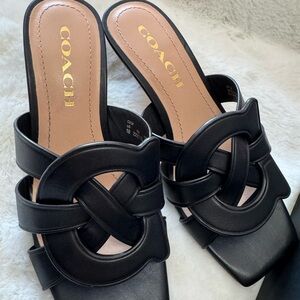 Elegant black leather slides with signature Coach design. Ideal for any occasion.