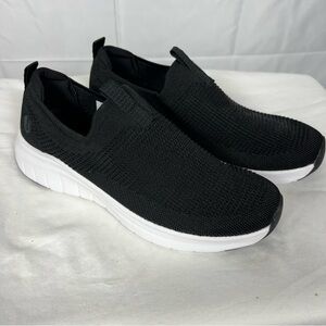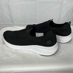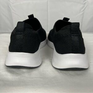 Lands’ End casual knit slip-on sneakers in black with white soles.