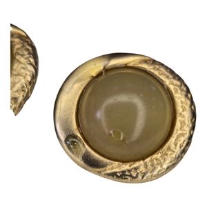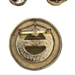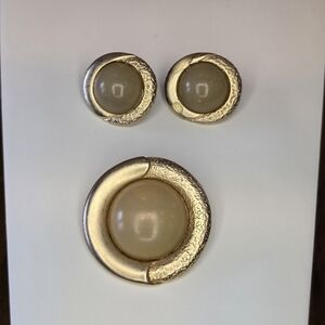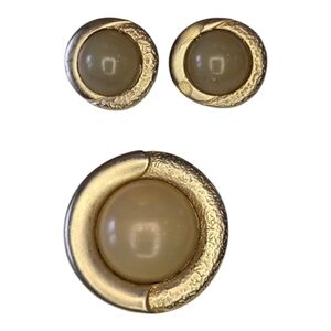 German jewelry designer Ernst Gideon Bek vintage round brooch thatcan be worn as a pendant and matching earring set. Brushed goldtone metal with tinted green center cabachon. Marked with butterfly on back.