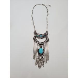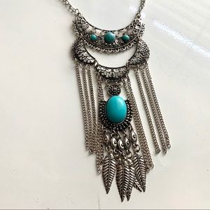 Boho Statement Collar Bib Necklace with faux turquoise stone + silver feathers