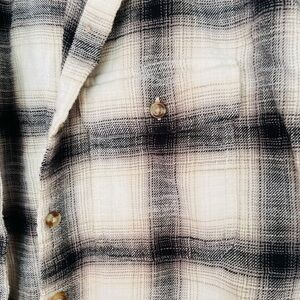 Classic checkered design with button closure. Perfect for layering. Frayed hem adds a trendy touch.