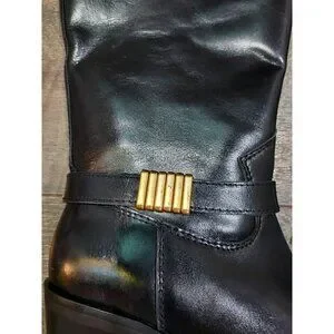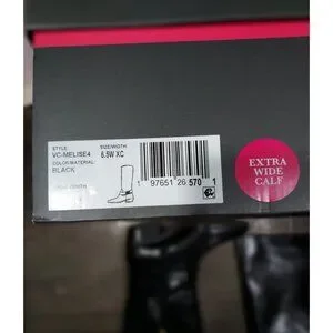 Vince Camuto Melise Extra Wide Calf Black Leather Knee High Boots in size 6.5W are stylish and versatile riding boot style perfect for various occasions such as travel, parties, casual outings, and workwear. These boots feature a square toe shape, low block heel, and extra wide calf width for a comfortable fit. Made of high-quality leather with a textile and man-made lining, these boots are designed for winter and fall seasons. The black color and solid pattern make them easy to pair with different outfits, while the metal accents add a touch of glam. Perfect for women looking for both fashion and comfort in their footwear.