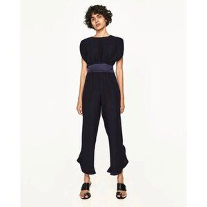 Zara Women's Navy Frilled Leg Sash Waist Sleeveless Jumpsuit
