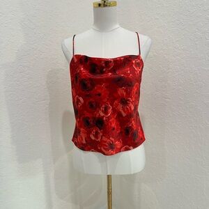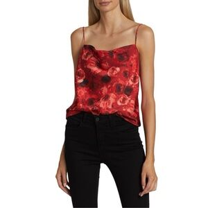 Alice + Olivia Harmon Satin Camisole in a red floral print. It features a flattering cowl neck and delicate spaghetti straps, and is generally made of polyester or silk blends.