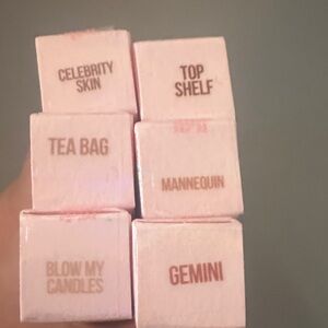 Set of Jeffree Star Supreme Gloss lipsticks. Includes shades of pink, brown, and gold. Vibrant and glossy finish.