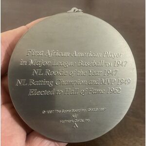 The 1997 Baseball Heroes Jackie Robinson L.A. Dodgers Hallmark Keepsake Ornament is a collectible ornament featuring the legendary baseball player Jackie Robinson. Manufactured by Hallmark in 1997, this ornament is part of a collection focused on baseball heroes. The ornament is designed for the Christmas season, making it a festive and nostalgic addition to any holiday decor. Perfect for fans of baseball and collectors alike, this Hallmark ornament celebrates the legacy of Jackie Robinson and the L.A. Dodgers team.