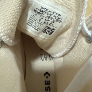 The product is a pair of Converse Chuck Taylor All Star Lift HI Women's Sneakers in size 11, Men’s size 9. These classic white sneakers feature a lace-up closure, canvas upper material, standard shoe width, and are part of the Converse Chuck Taylor All Star model line. With a UK shoe size of 9 and EU shoe size of 42.5, these casual sneakers are designed for women who appreciate both style and comfort in their footwear choice.