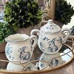 NEW! Vintage Inspired French Floral Toile Blue & White Bunny Sugar & Creamer Set