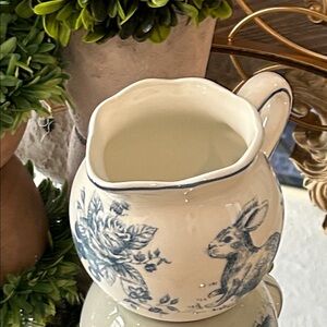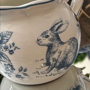 Absolutely Exquisite! Vintage Inspired Shabby Chic French Cottage Victorian Creamy White & Blue Toile Ceramic Sugar Bowl Lid & Creamer Pitcher 3 Piece Set! This beautiful set is so detailed with a scalloped edge & elegant toile pattern! This fantastic serving set has a lovely blue spring bunny rabbit roses & flower toile pattern on one side and gorgeous large roses flowers & berries on reverse side! Fabulous accent for your home this spring Easter holiday season & beyond! Use year round! Fantastic serving pieces for your tabletop or coffee bar or beverage center! Fantastic addition to your kitchen counter, dining room buffet server, bakers rack, table, cabinet , shelf or hutch when not in use! Find coordinating pitcher or serving dish as seen in the last photos listed in my closet!