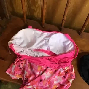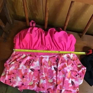 This pre-owned Kona Sol women's swim set includes a pink floral tankini top and black swim shorts. The tankini top, labeled size 2XL, features a solid hot pink ruched bodice with adjustable straps and a floral-patterned skirt in shades of pink, orange, and white. It measures approximately 16 inches across the waist and 26 inches in length. The black swim shorts, labeled size L, have ruched sides and measure approximately 17 inches across the waist. Both pieces are made of 82% polyester and 18% elastane.