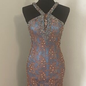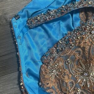 Vtg RIVA DESIGNS Y2K Orange/Blue Beaded Sheer Lace Gown HOCO Evening Prom Sz 0