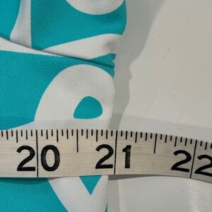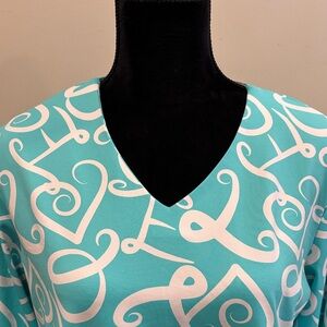 Stylish turquoise/teal blue top with LOVE in white script heart letters. Features a V-neck and three-quarter sleeves. Perfect for Valentines/Galentine's Day